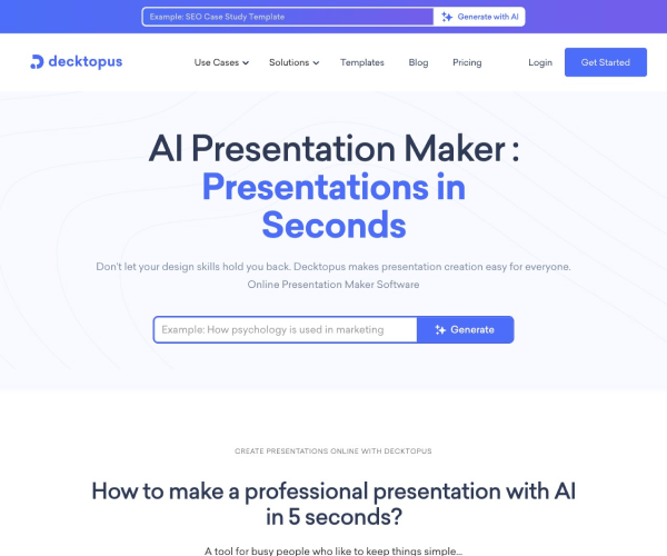 Decktopus是一个AI驱动的的在线演示文稿生成器,该 AI生成PPT工具 易于使用、操作直观,提供自动幻灯片布局和交互式表格等功能,只需要几分钟,用户便可以创建出效果令人惊叹的演示文稿。