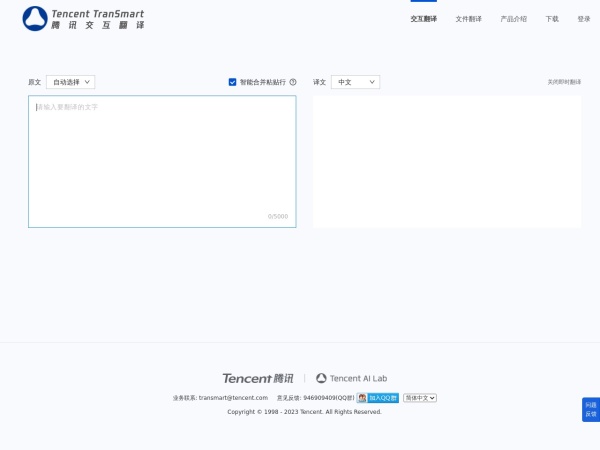 腾讯交互翻译TranSmart是由腾讯AI Lab发布的一款AI辅助翻译产品,可满足用户快速翻译的需求,用AI辅助人工翻译提高效率和质量。TranSmart采用了团队自研的人机交互式机器翻译技术,融合神经网络机器翻译、统计机器翻译、输入法、语义理解、数据挖掘等多项前沿技术,配合亿级双语平行数据,是一款人工智能辅助翻译互联网落地产品,可为用户提供实时智能翻译辅助,帮助用户更好更快地完成翻译任务。