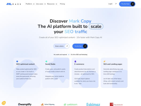 Mark Copy是一个人工智能技术驱动的SEO写作和营销文案工具,该工具提供了多达40个模板帮助你处理所有文案内容,如生成博客文章、产品描述和社交媒体帖子。只需输入一些文本描述,如标题、风格和主要关键词,Mark Copy就会为你快速生成SEO优化友好的内容。