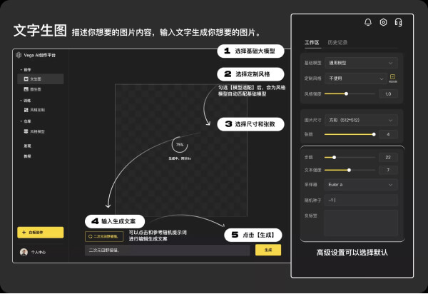Vega AI是国内初创公司右脑科技(RightBrain AI)推出的在线训练应用AI创作平台,是一款免费的AI创作工具,支持在线训练AI绘画模型,支持文生图,图生图,条件生图等多种绘画模式。