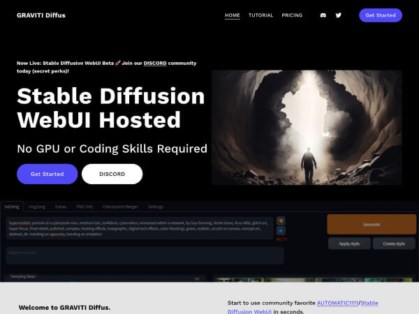 Graviti Diffus 提供热门的开源项目 Stable Diffusion WebUI 的在线服务,让你零基础快速生成图片图像。